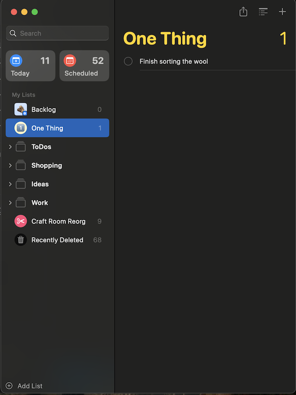 I’ve created a new list in Reminders.app called One Thing. This is the one thing that I would like to have done by the end of the week. If needed, I break down the One Thing into smaller tasks and assign them throughout the week. Each Wednesday I review the One Thing to see whether I’m on track or whether adjustments are needed. Each Sunday I review and reset the One Thing for the next week.